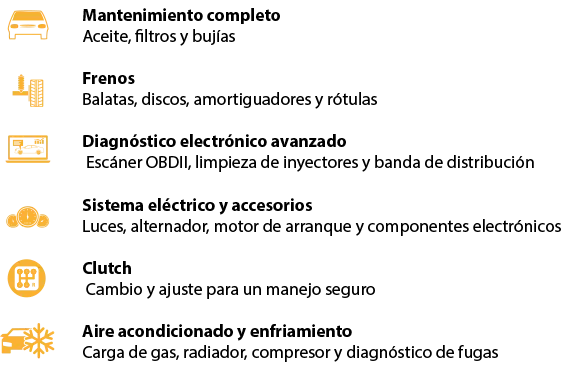 En nuestro centro automotriz, cada servicio está diseñado para garantizar la máxima seguridad, rendimiento y confiabilidad de tu vehículo. Desde mantenimiento preventivo hasta diagnóstico avanzado, cuidamos tu auto con precisión y tecnología de punta.